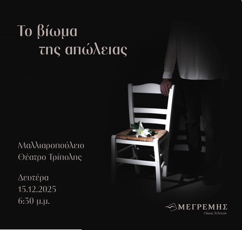 Με αίσθημα υψηλής ευθύνης, βαθειάς ανθρωπιάς, ειλικρινούς σεβασμού και τιμής της ανθρώπινης αξιοπρέπειας διοργανώνει για πρώτη φορά στην Τρίπολη μια πρωτοποριακή εκδήλωση με τίτλο «Το Βίωμα της Απώλειας», η οποία θα πραγματοποιηθεί τη Δευτέρα 15 Δεκεμβρίου 2025 και ώρα 18:30, στο Μαλλιαροπούλειο Θέατρο.