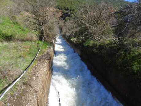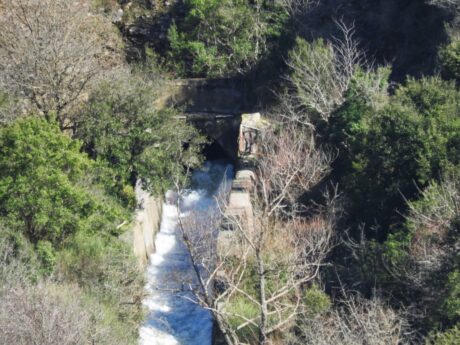 Η είσοδος της σήραγγας στη θέση Μουριές στη Βλαχέρνα, το νερό περνά από την ανοιχτή πόρτα στο αριστερό μέρος της φωτογραφίας.