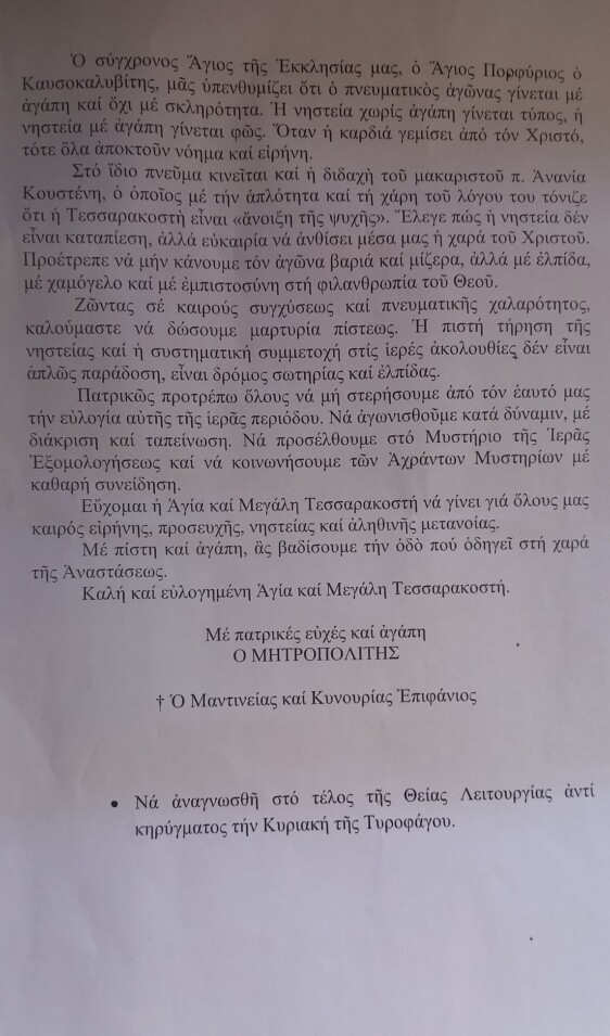 Έβαζαν και αυγά στη σπούρνη με τη μύτη προς τα πάνω. Αυτού που ίδρωνε το αυγό αν ήταν νέος ή νέα πλησίαζε η παντρειά. Στο σοφρά έδιναν και έπαιρναν τα τσουγκρίσματα με το κοκκινέλι κι ευχώσαν Καλή Σαρακοστή και συχωράγανε τις ψυχές. Ξέχασα, στο κάθε αυγό μελέταγαν και το άτομο κι ήξερε ο καθένας το δικό του. Αν ίδρωνε των γερόντων το αυγό σήμαινε ευτυχία και πλούτη θα πέσουν στο σπίτι. Αν έσκαγε κάνα αυγό λέγανε το σκάσε ο διάβολος. Επακολουθούσε γλέντι τρικούβερτο ακόμα και χορός και σαν πλησίαζαν τα μεσάνυχτα το τελευταίο έδεσμα ήταν οι νεροχυλοπίτες στραγγιχτές τσιγουρισμένες με γουρναλοιφή και με γαρνιτούρα μυτζήθρας.