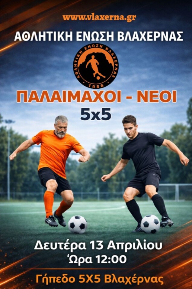ΔΕΥΤΕΡΑ ΤΟΥ ΠΑΣΧΑ: ΠΟΔΟΣΦΑΙΡΙΚΟΣ ΑΓΩΝΑΣ “ΠΑΛΑΙΜΑΧΩΝ – ΝΕΩΝ” ΣΤΗ ΒΛΑΧΕΡΝΑ!