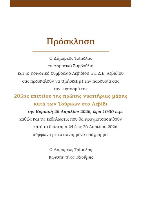 Παρακαλοῦμε τούς τιμῶντας τήν μνήμην αὐτοῦ, ὅπως συμπροσευχηθῶσι μεθ’ ἡμῶν, ὑπέρ ἀναπαύσεως τῆς ψυχῆς του, κατά τήν Θείαν Λειτουργίαν καί τό Ἀρχιερατικόν Μνημόσυνον πού θά τελέσωμεν εἰς τόν Ἱερόν Ναόν Τιμίου Προδρόμου Λεβιδίου Ἀρκαδίας τό Σάββατον 25ην Ἀπριλίου 2026 καί ὣραν 8:30 πρωινήν