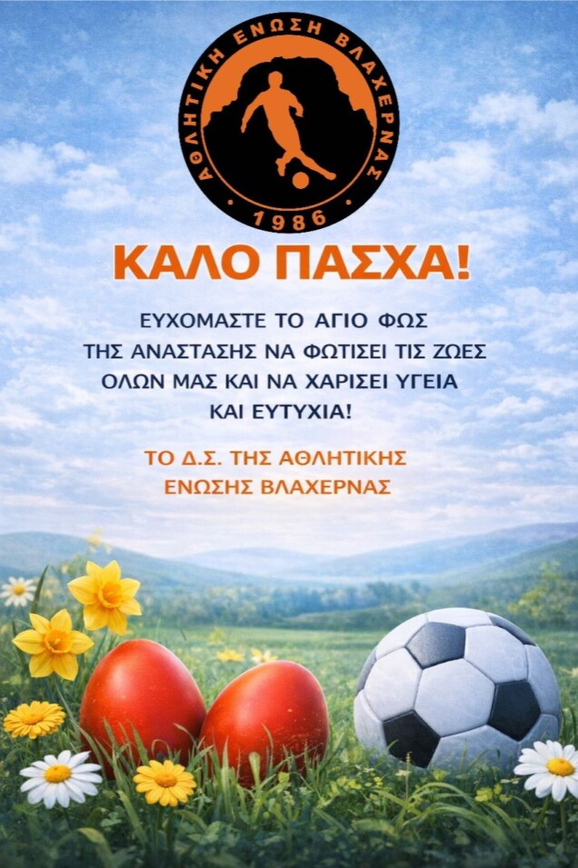 Η Αθλητική Ένωση Βλαχέρνας – Α.Ε.Β, διοργανώνει και φέτος τον καθιερωμένο επετειακό αγώνα μεταξύ Παλαιμάχων και Νέων τη Δευτέρα του Πάσχα στο γήπεδο 5×5 του χωριού μας!!