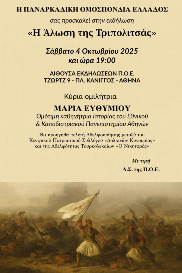 ΕΚΔΗΛΩΣΗ ΑΠΟ ΤΗΝ ΠΑΝΑΡΚΑΔΙΚΗ ΟΜΟΣΠΟΝΔΙΑ ΕΛΛΑΔΟΣ ΤΟ ΣΑΒΒΑΤΟ 4 ΟΚΤΩΒΡΙΟΥ 2025