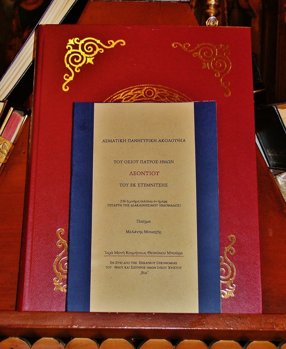 Τῆς Στεμνίτσης τόν γόνον καί Βλαχέρνης τόν ἒφορον, τόν τῆς Ἀρκαδίας σπηλαίων πνευματέμφορον λέοντα, τόν ὃσιον Λεόντιον πιστοί, λαμπάσι Ἀναστάσεως φαιδραῖς, ὑπαντήσωμεν τιμῶντες σεμνοπρεπῶς, καί πίστει αναβοῶντες˙ Δόξα τῷ Ἀναστάντι ἐκ νεκρῶν, δόξα τῷ σε ἀναστήσαντι, δόξα τῷ ἀνιστῶντι καί ἡμᾶς, ἐκ τάφου θλίψεων.