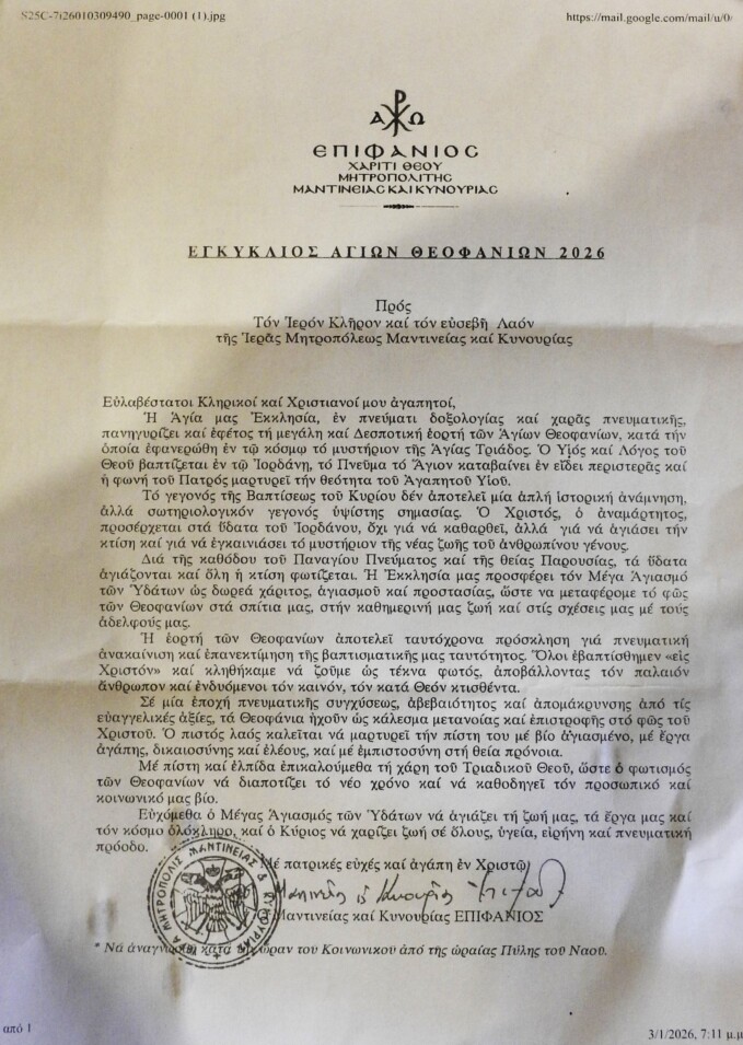 Ανάγνωση από τον π. Ιωάννη, της Εγκυκλίου των Αγίων Θεοφανίων του Σεβασμιότατου της Ι.Μ. Μαντινείας και Κυνουρίας κ.κ. Επιφανίου.