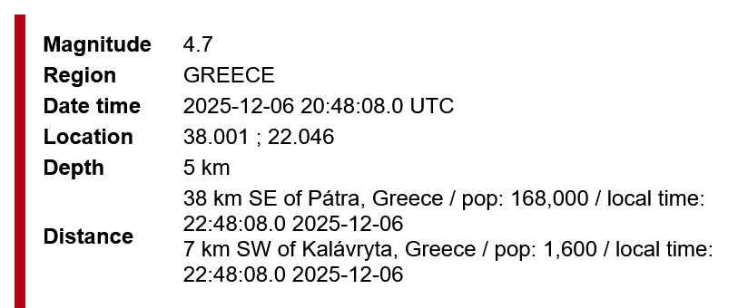 Σεισμική δόνηση σημειώθηκε πριν από λίγο, στις 22:48 το βράδυ του Σαββάτου (06/12/2025). Το Ευρωπαϊκό Μεσογειακό Σεισμολογικό Κέντρο δίνει τα παρακάτω στοιχεία: